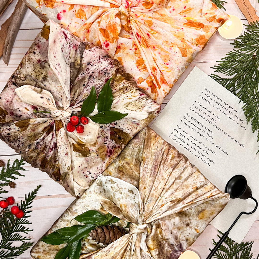 * Wrap gifts with eco printed silk, adorn them with pressed flower gift tags + send botanically printed cards