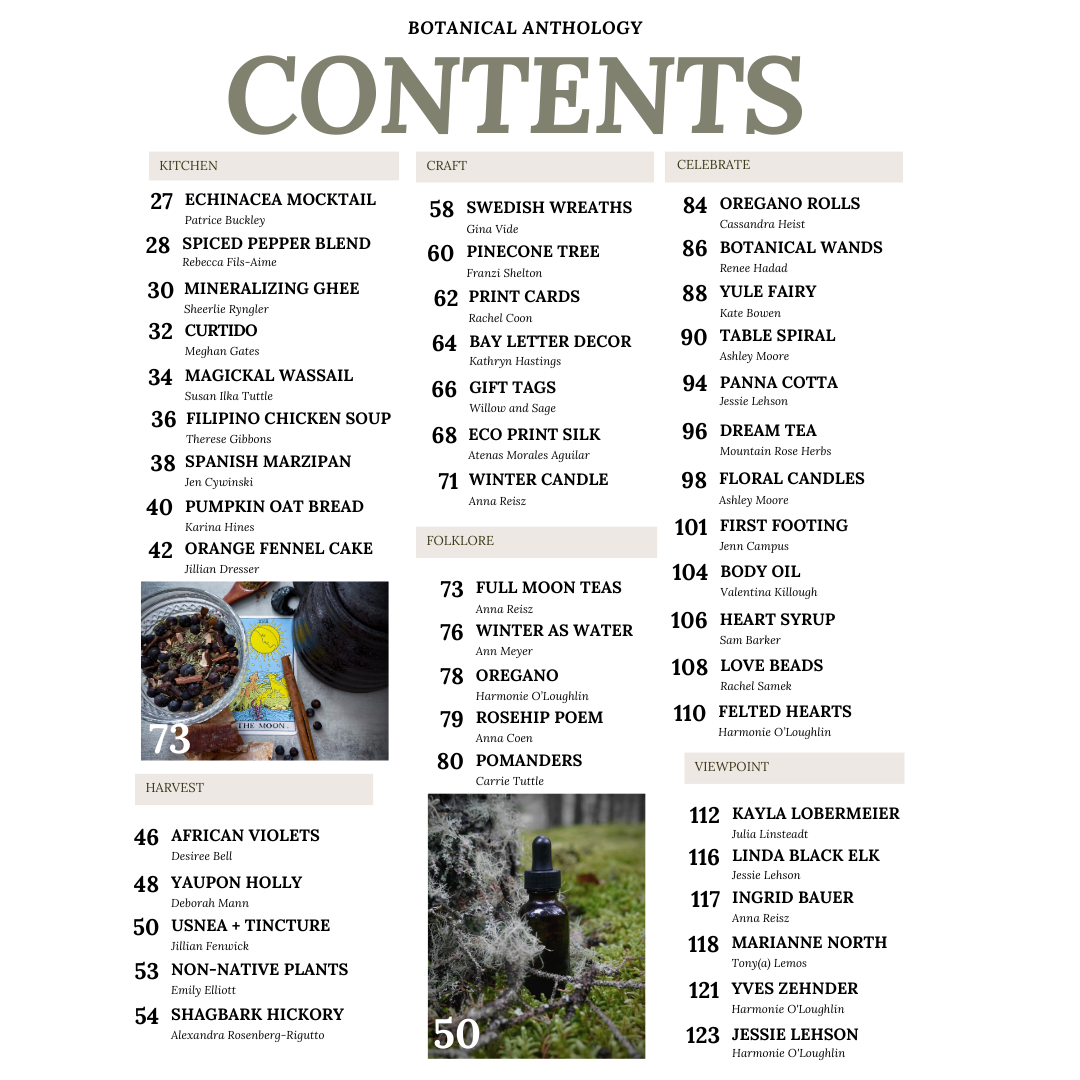 This publication is comprised of 7 subsections: Apothecary, Kitchen, Harvest, Craft, Folklore, Celebrate + Viewpoint. We also have many fun features throughout the publication. Take a peek at the images to see the full table of contents!