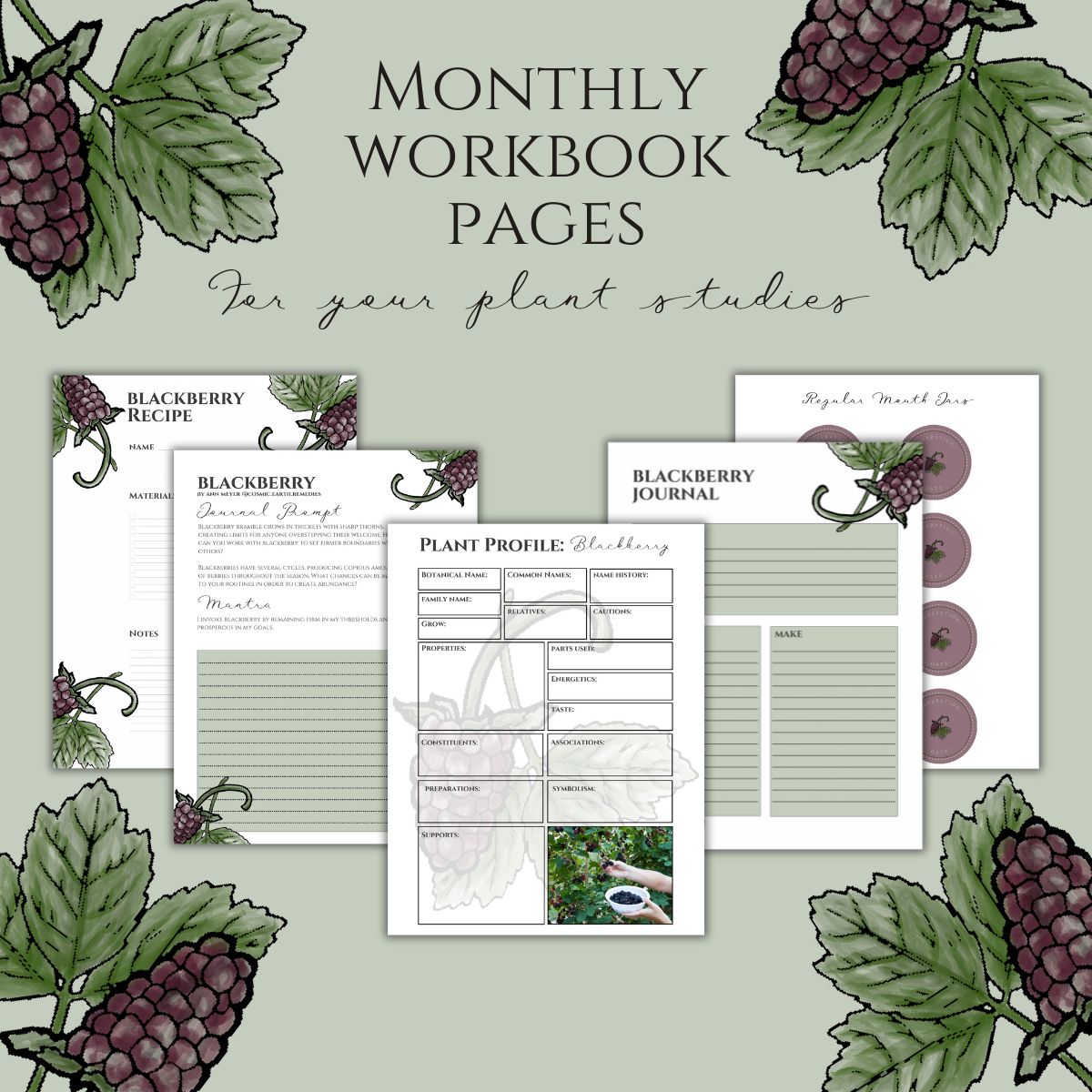 To support your Blackberry studies, this bundle contains PDFs ready for you to create your very own Plant Profile, take Journal Notes, contemplate Journaling Prompts and Mantra, utilize pretty Jar Labels for your creations, fill-in Recipe Card and use our Book Mark as you study.