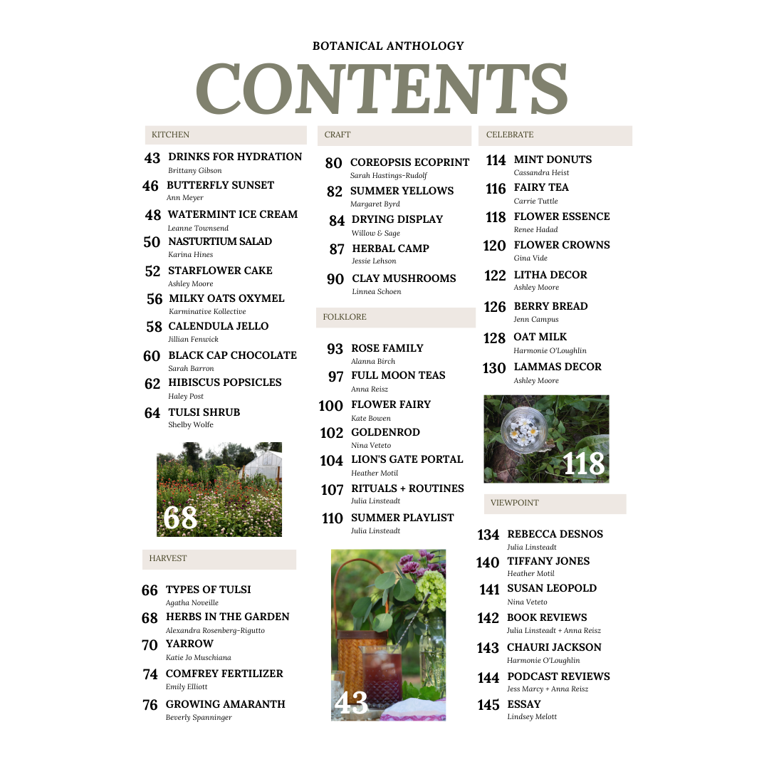 This publication is comprised of 7 subsections: Apothecary, Kitchen, Harvest, Craft, Folklore, Celebrate + Viewpoint. We also have many fun features throughout the publication.