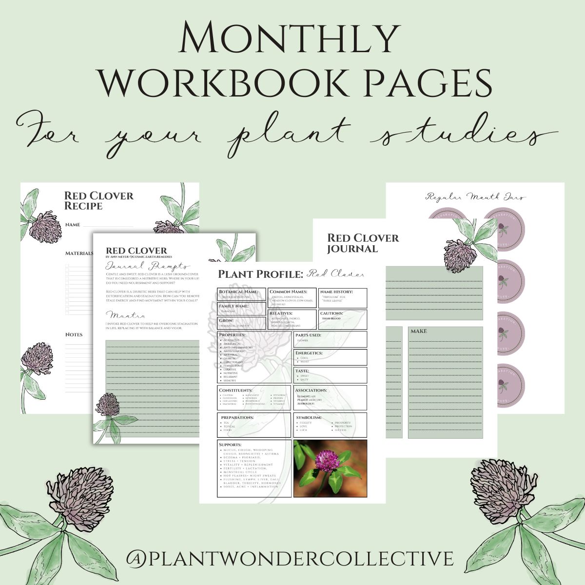 To support your Red Clover studies, this bundle contains PDFs ready for you to create your very own Plant Profile, take Journal Notes, contemplate Journaling Prompts and Mantra, utilize pretty Jar Labels for your creations, fill-in Recipe Card and use our Book Mark as you study.